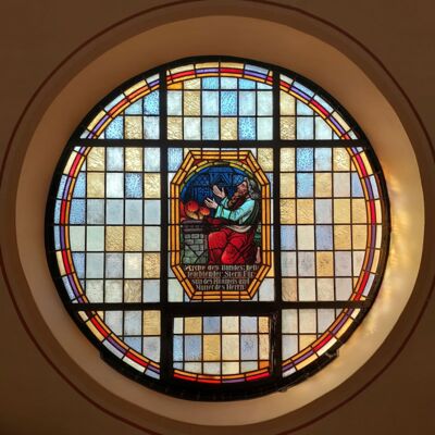 Einbau der vier kunstvoll bemalten großen Fenster