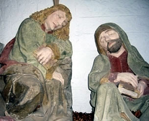 Christus ist kniend dargestellt. die drei Apostel Petrus, Jakobus und Johannes sitzend und schlafend. Die Figuren sind in halber Lebensgröße dargestellt. Im Hintergrund ist Judas Iskariot mit Soldaten zu sehen, von denen einer den Zaun übersteigen will. Die gesamt Komposition des Kunstwerks ist typisch für die Zeit um 1500.