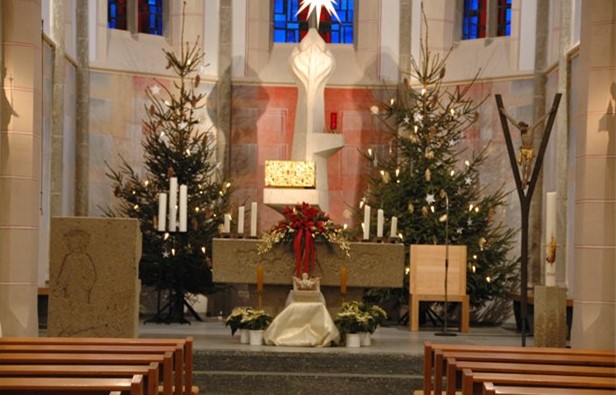 darstellte. - Der Altartisch stand jetzt weiter vorne, da das Konzil Priester und Gläubige als gemeinsam