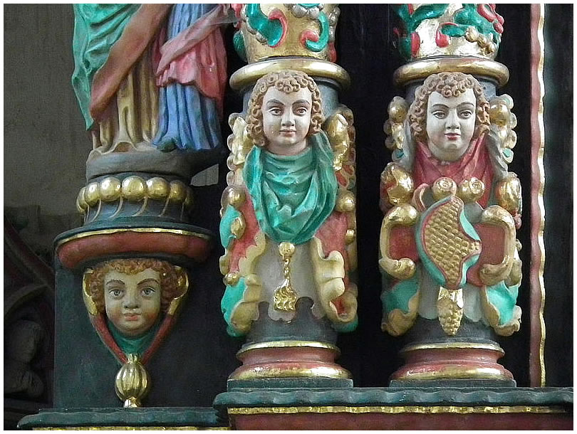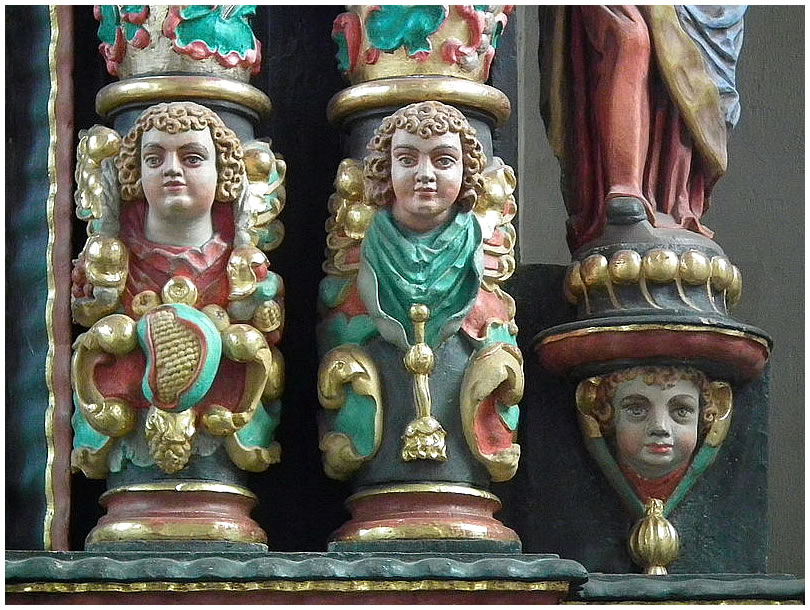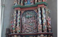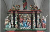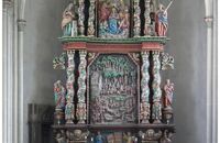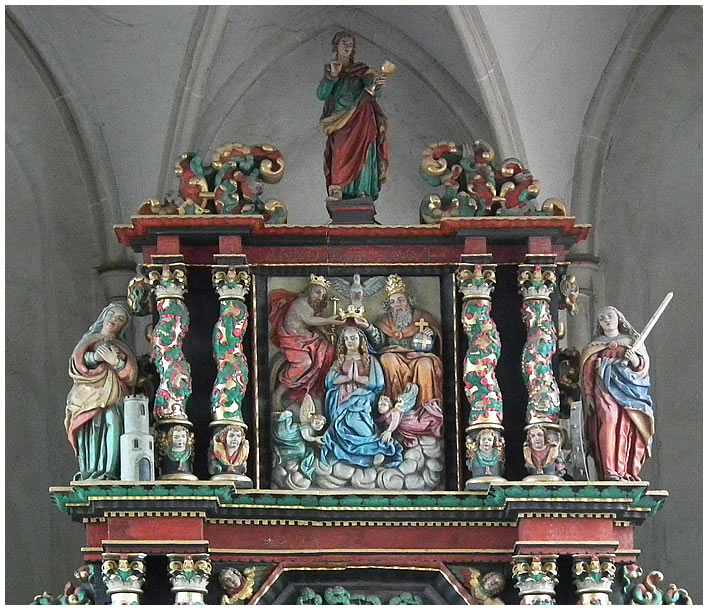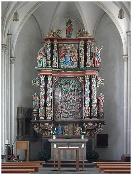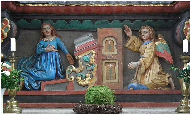 Im Inneren der Kirche befindet sich ein Hochaltar mit einem Altartisch aus dem 13. Jahrhundert, über dem sich der Altaraufsatz aus Tuffstein von 1664 erhebt. Hier sind neben der Verkündigung Mariens auch die Hauptszenen der Genovevasage dargestellt.
