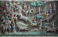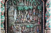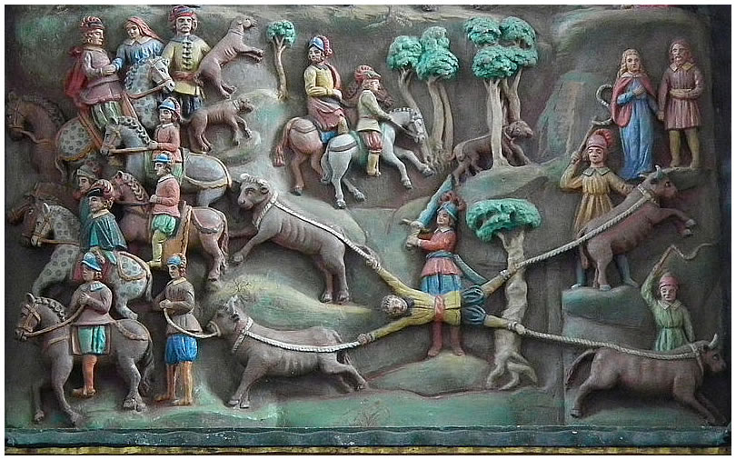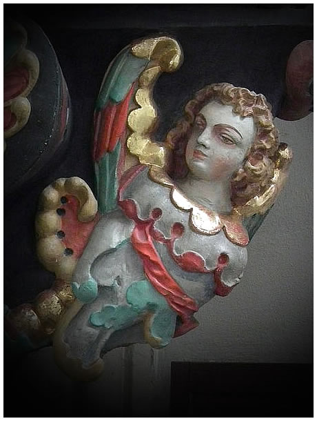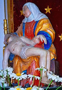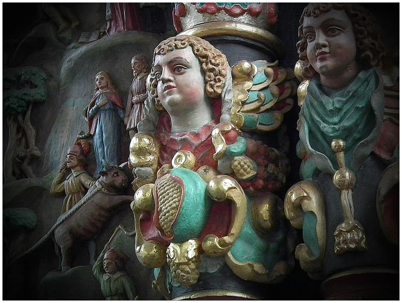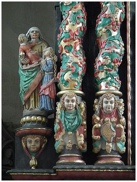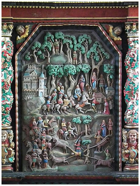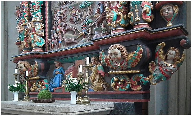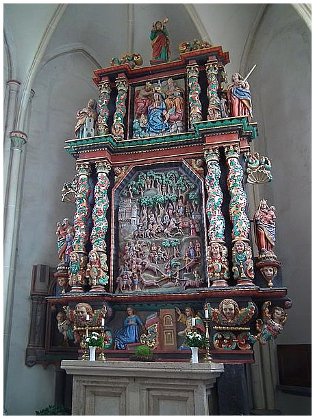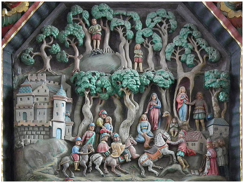 Nach der regionalen Genovevasage baute Pfalzgraf Siegfried, der in Mayen im 8. Jahrhundert residiert haben soll, die Kirche zum Dank für die Errettung seiner Frau Genoveva durch die Gottesmutter Maria. Das aus farbig gefasstem Tuff bestehende Altarbild aus dem Jahre 1667 zeigt in prächtiger, plastischer Darstellung in Form einer Bildergeschichte den Ablauf der Legende. In einer hinteren Ecke des Gebäudes steht aufrecht eine Grabplatte mit einer lebensgroßen Darstellung eines Ritters und seiner Frau, vermutlich Siegfried und Genoveva.